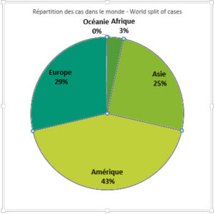 La situation globale reste préoccupante car la courbe du nombre de cas cumulés ne montre toujours pas d’infléchissement au niveau mondial. La cinétique semble de nouveau s’orienter vers une progression affine de type y = 2x (soit une pente 60%) et non plus exponentielle. Heureusement, l’écart avec la cinétique de la mortalité continue toujours de se creuser.