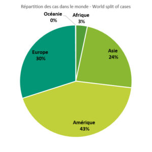 La part relative de la région Asie recule toujours au profit de celle de l’Europe qui s’approche progressivement du 1/3 des cas mondiaux alors que la part relative de la région Amérique reste stable. Ce point remarquable semble confirmer pour l’instant le caractère rotatif d’Est en Ouest de la circulation du virus au niveau mondial (il y a 5 mois c’était l’Asie qui tendait vers le 1/3 des cas mondiaux).